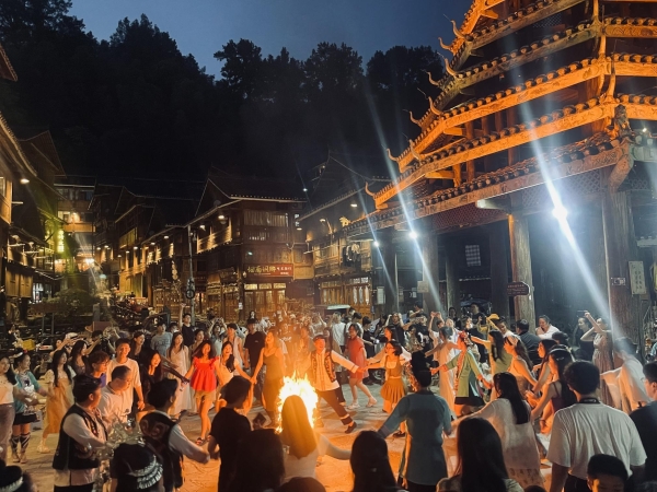 24日晚上,肇兴侗寨老百姓为我校音乐专业师生举行了热闹的篝火晚会,师生们与侗族阿哥、阿姐一起围着篝火唱响了侗族大歌《天地人间充满爱》。那无伴奏的混声合唱宛如天籁之音,令在场的所有师生都惊叹不已,深深地沉浸其中。侗族大歌为多人分声部无伴奏大合唱,合唱者都没有经过专业的声乐训练,只凭天生对音乐的敏感,数十人合唱时就可以将高音部、低音部、混声、和声、轮唱、花腔等等唱法发挥得淋漓尽致,令人听得荡气回肠,不可思议。2009年侗族大歌被列入“世界非物质文化遗产”,是中华民族艺术宝库中一颗璀璨夺目的明珠。在篝火晚会中,师生们近距离地感受侗族大歌的超凡艺术魅力,歌声在肇兴侗寨的夜空中长久地回荡。