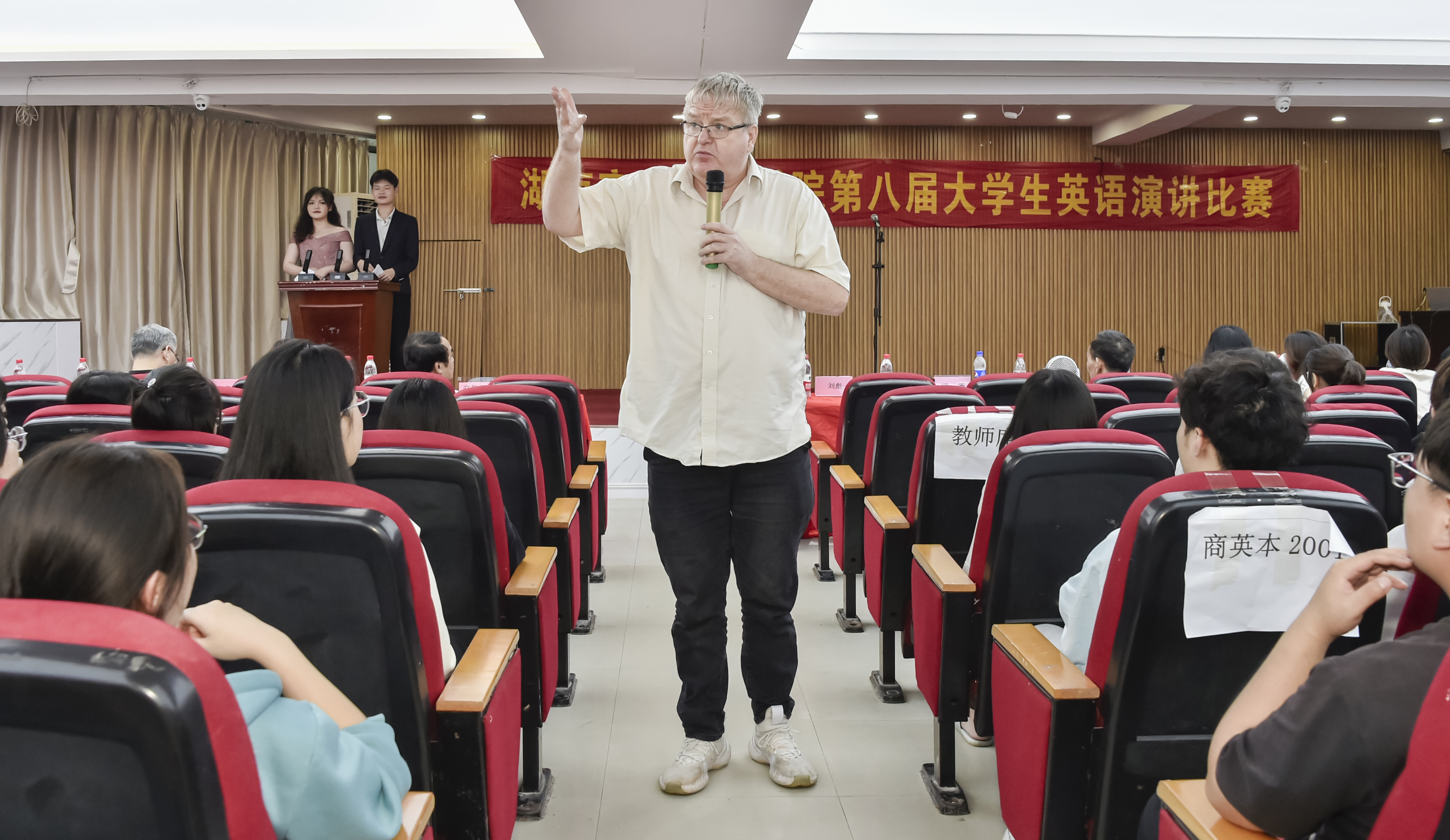 提问环节,选手们思维敏捷,对答如流,展现了湖南交通工程学院学子的优秀精神风貌。当问及当下最热门的 livestreaming shopping(直播购物)时,选手侃侃而谈,不仅以大家熟知的李佳琪、明星带货为例,带领大家回顾直播购物的乐趣,更从最近火出圈的跨境电商主播用英文直播带货、用流利的英文向国外消费者介绍中国产品的“中国智慧”出发,结合自身的专业特点和职业规划,立志为国货通过新媒体平台打开更广阔的世界市场。赛后,外籍教师william和商务英语教研室主任袁芳从发音准确性、演讲感染力、表达流畅性和思想深度广度等方面对选手们的表现作了精彩点评。