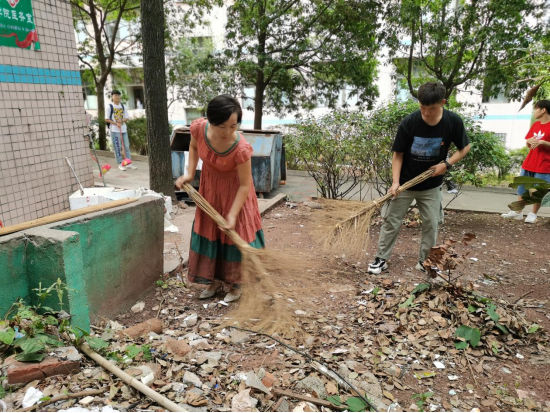 (在书记罗斐、副书记漆在林、学生支部书记夏翠云及各班辅导员的组织带领下同学们积极参与、勤劳苦干、认真打扫环境区卫生)